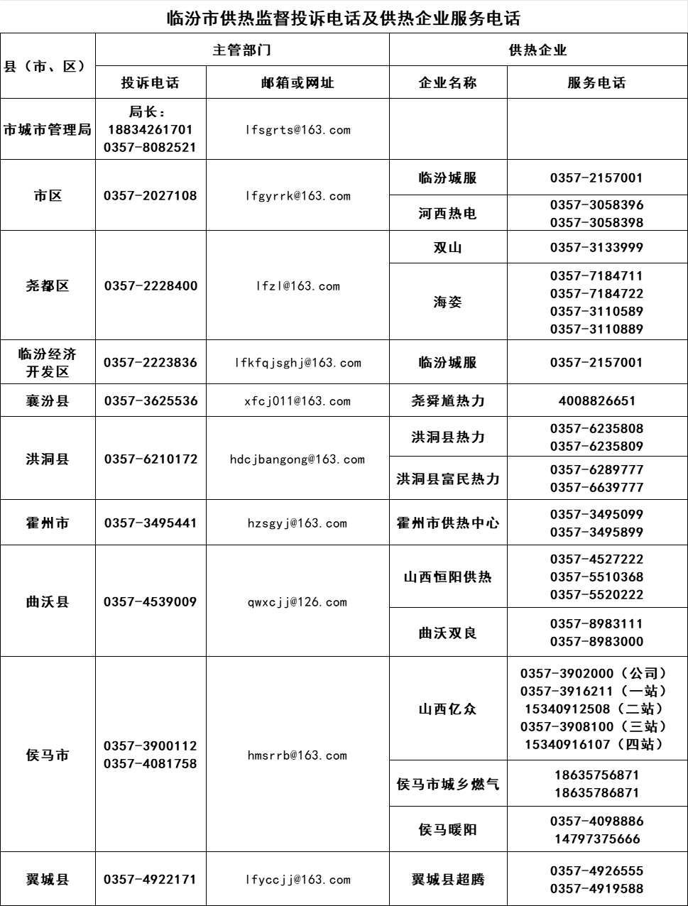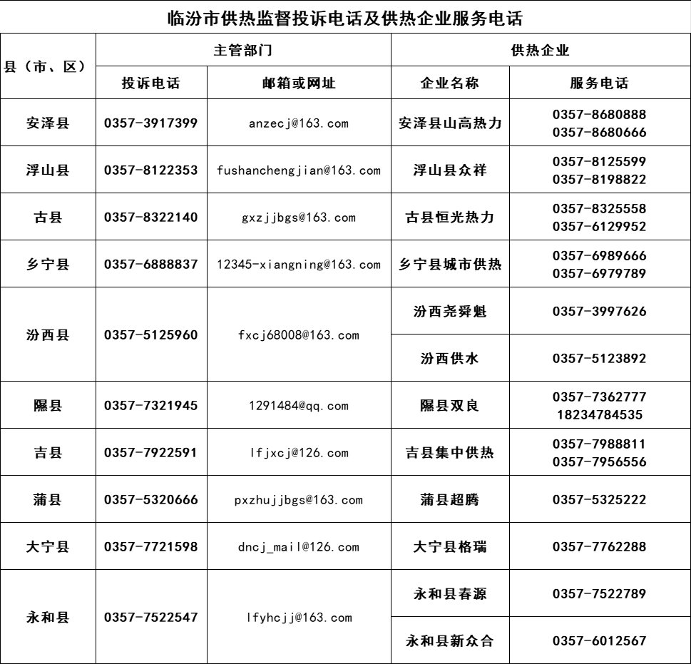 为做好2025-2026年度城镇供热采暖工作,帮助热用户解决供热中存在的问题和诉求,现将各县(市、区)集中供热主管部门监督投诉电话、邮箱和供热企业服务热线予以公布,若有需求请拨打相关电话,我们将竭诚为您服务。