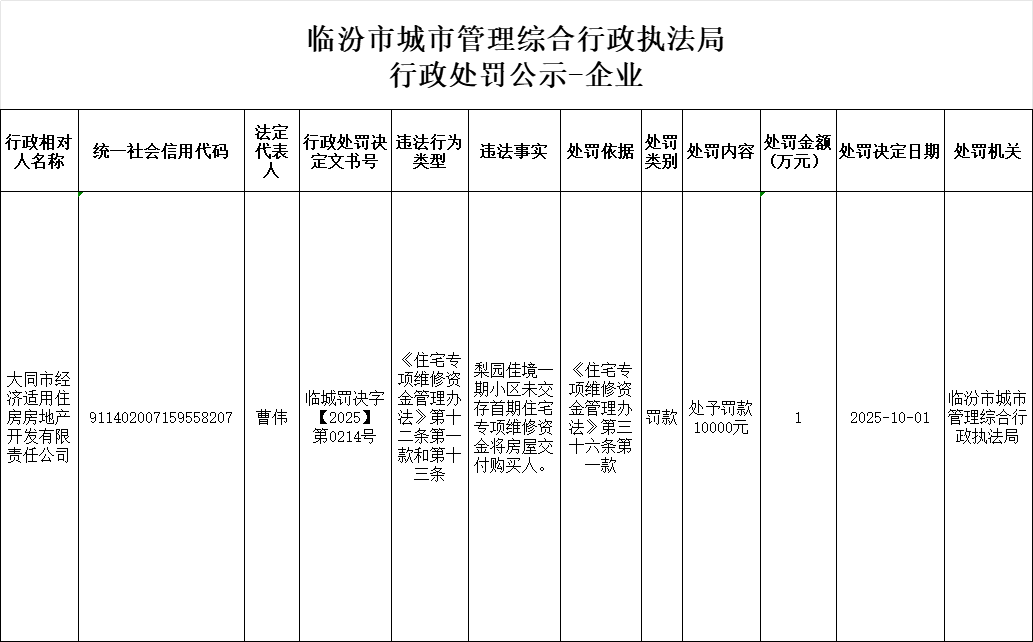 行政处罚公示-大同市经济适用住房房地产开发有限责任公司