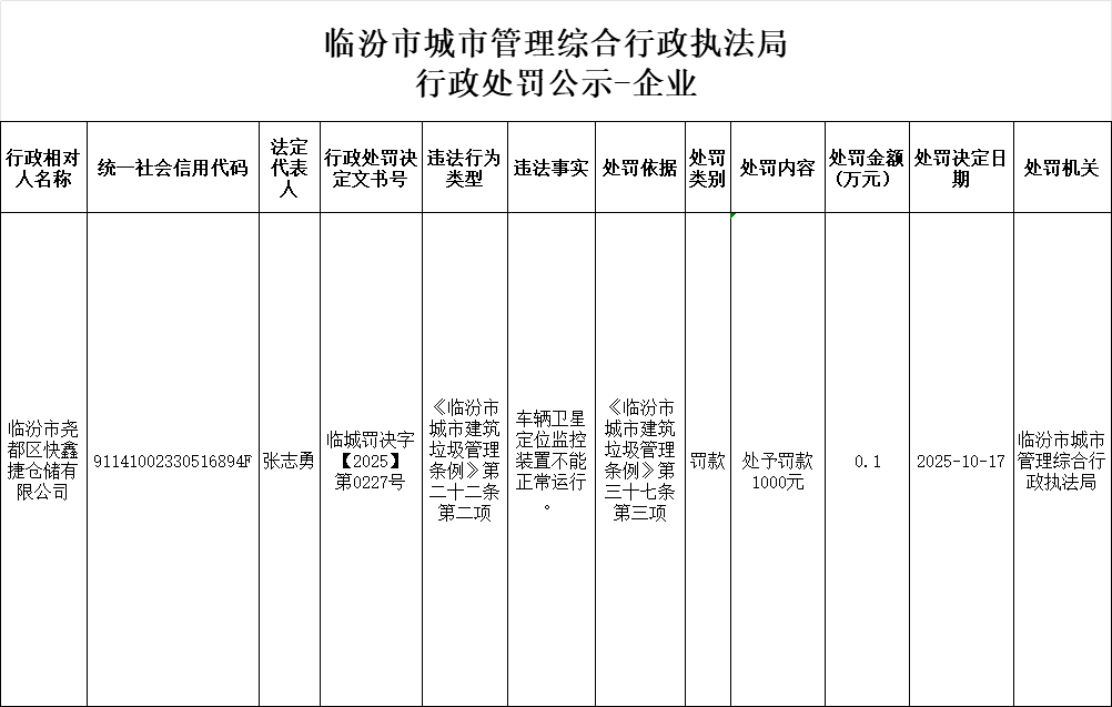行政处罚公示-临汾市尧都区快鑫捷仓储有限公司