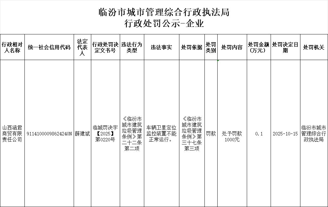 行政处罚公示-山西涵君商贸有限责任公司