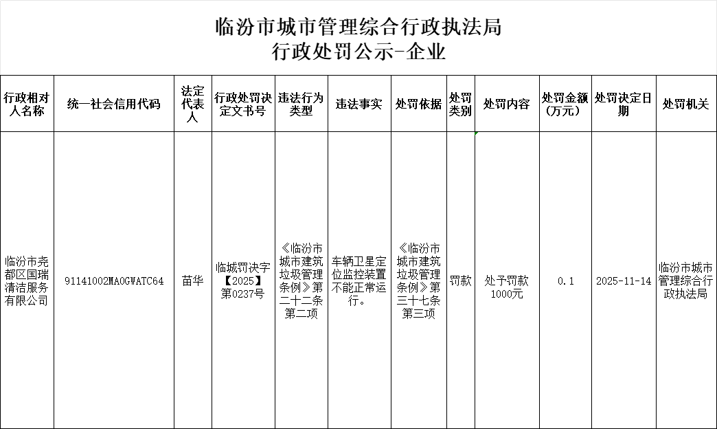 行政处罚公示-临汾市尧都区国瑞清洁服务有限公司