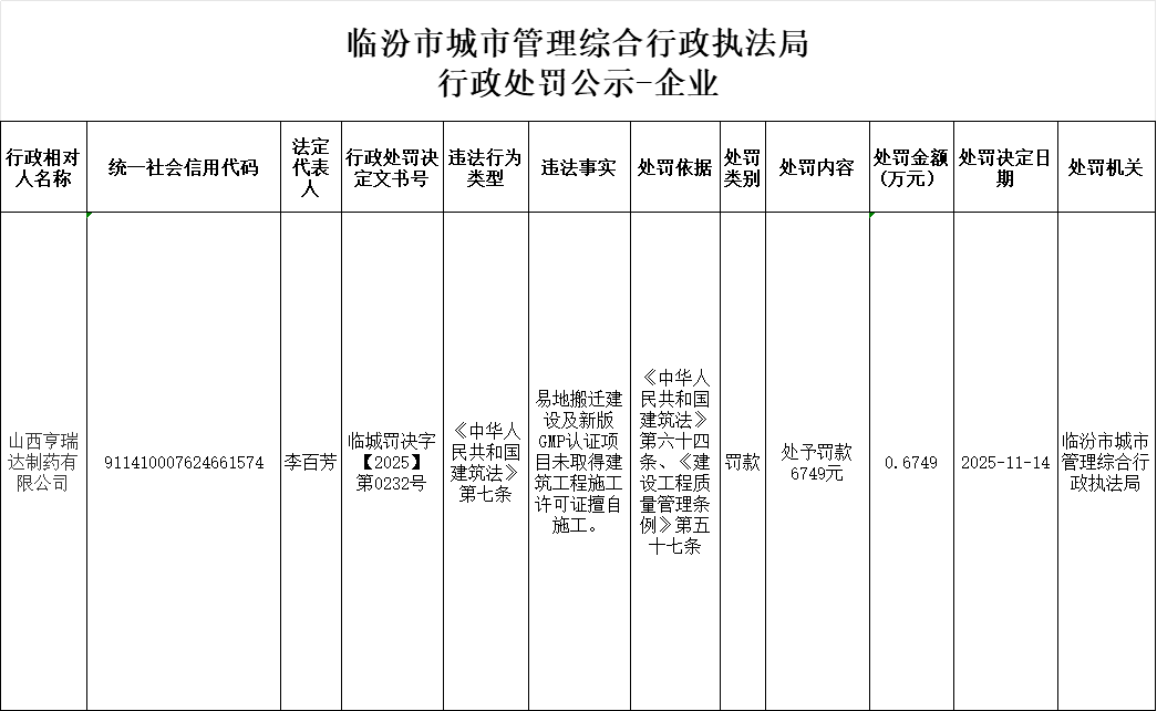 行政处罚公示-山西亨瑞达制药有限公司