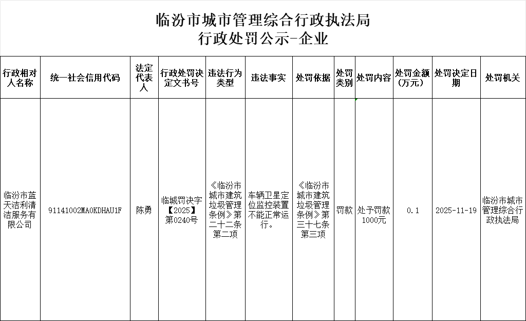 行政处罚公示-临汾市蓝天洁利清洁服务有限公司