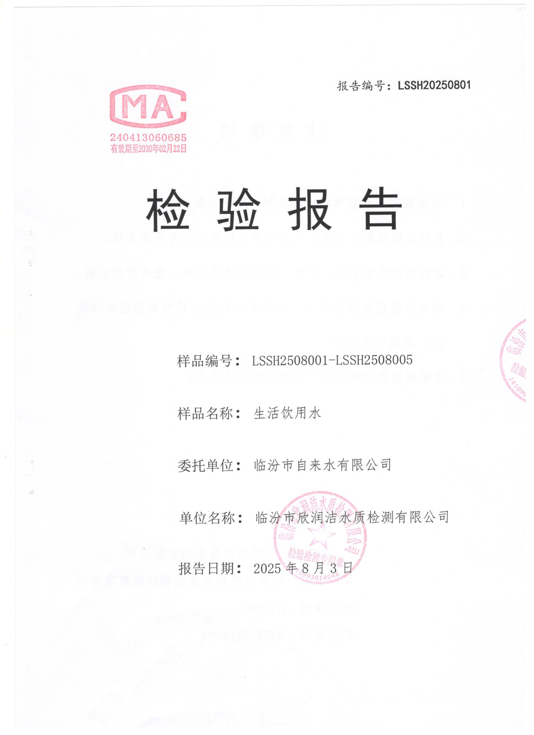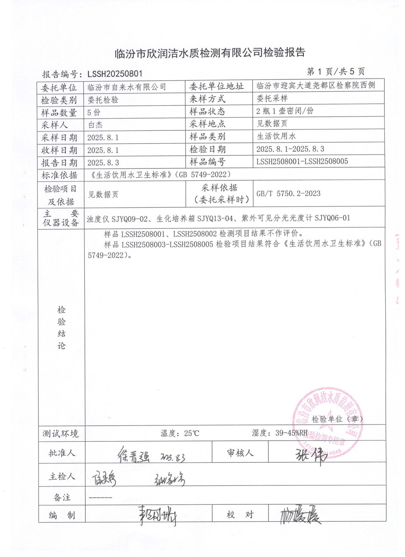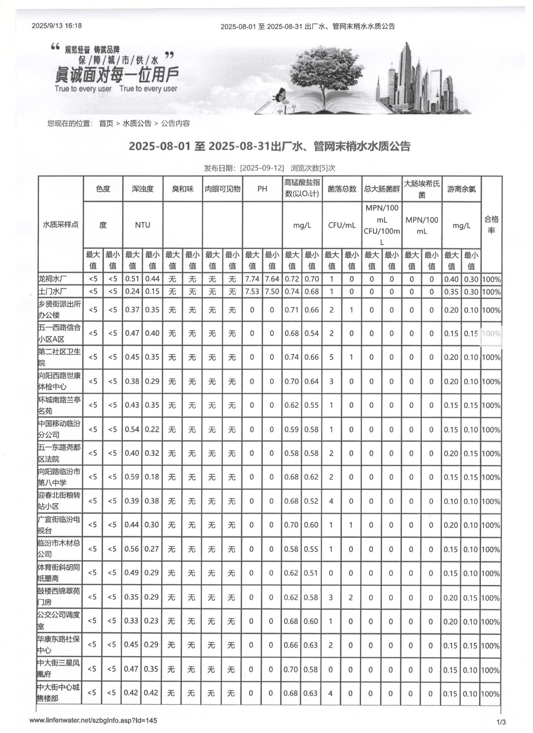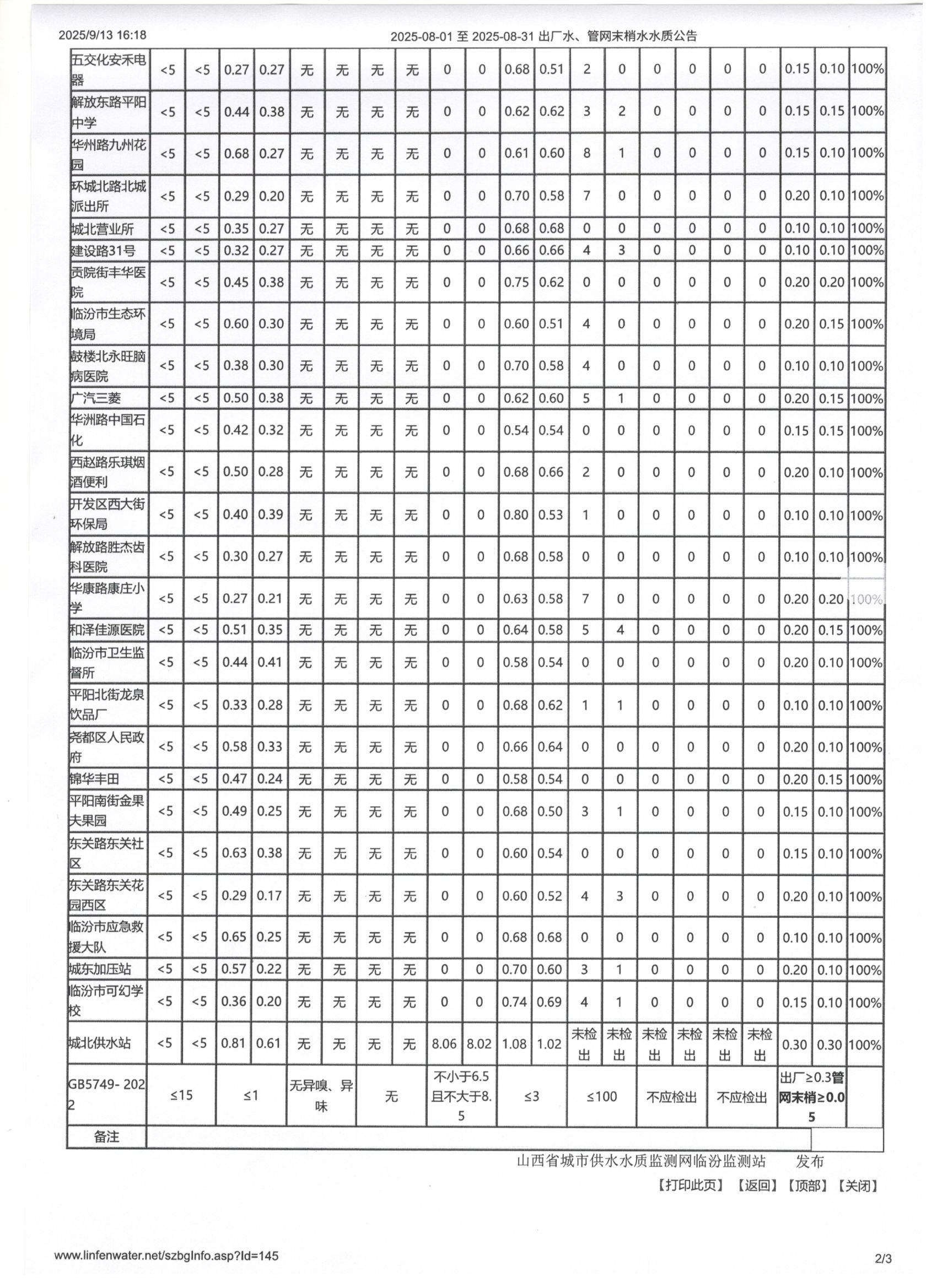 临汾市城市管理局2025年8月份生活饮用水水质监测报告