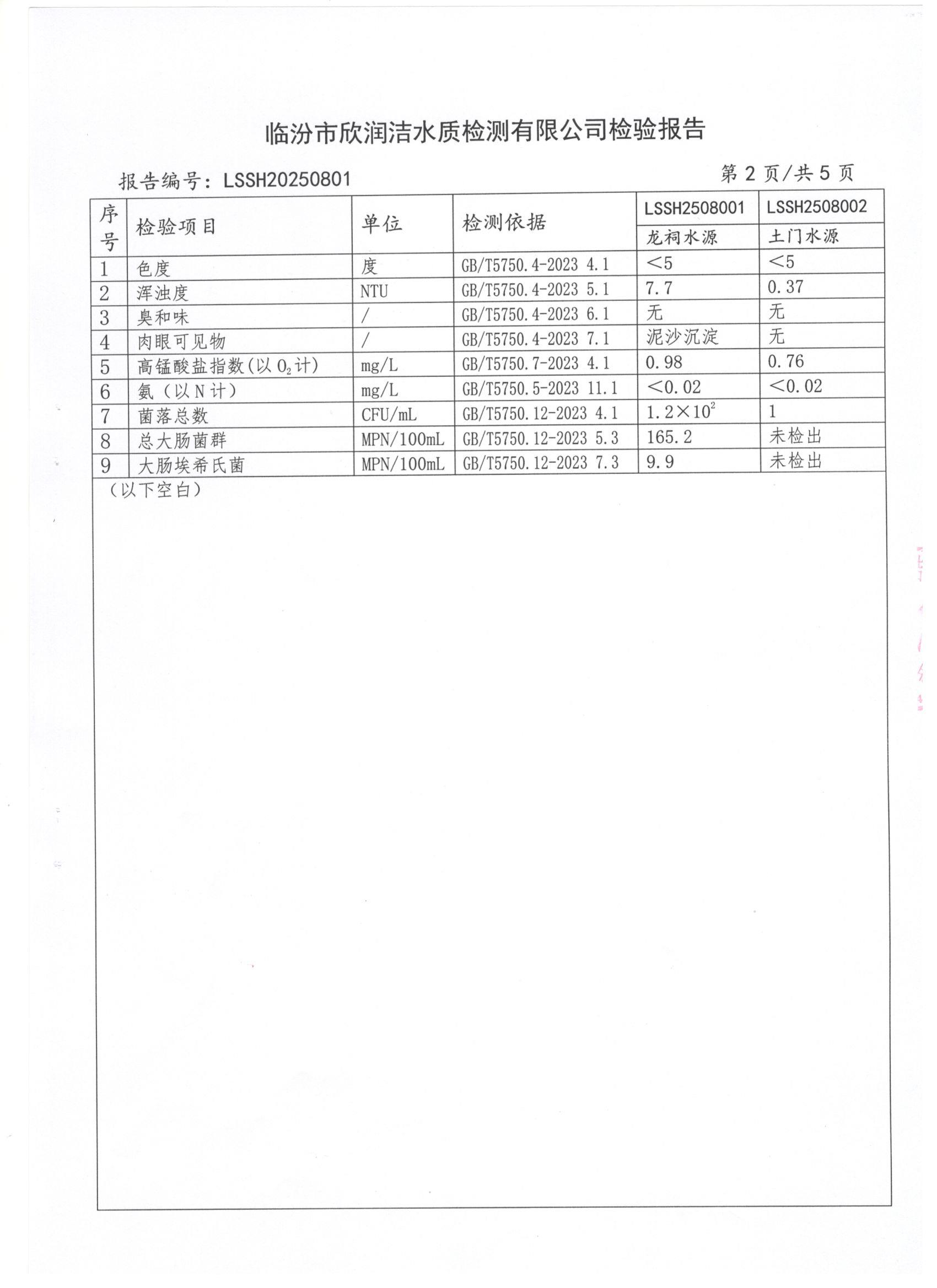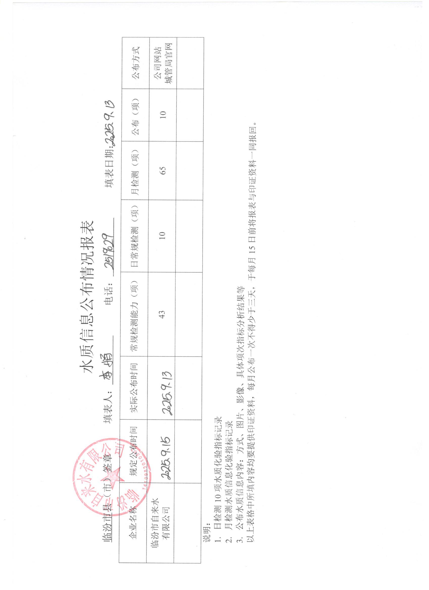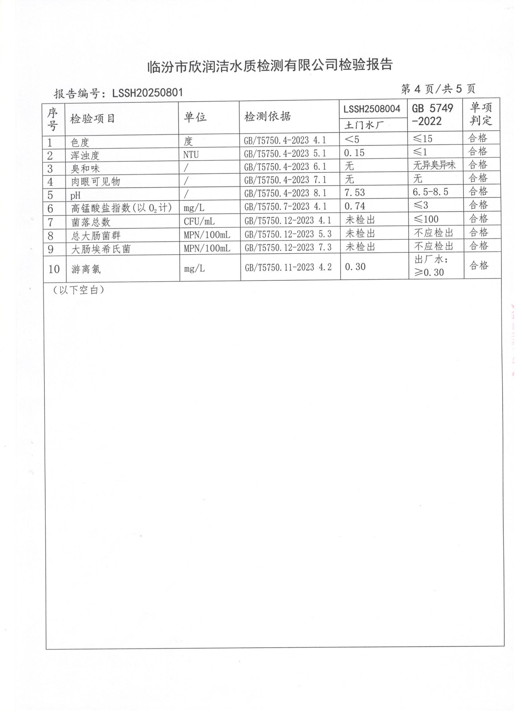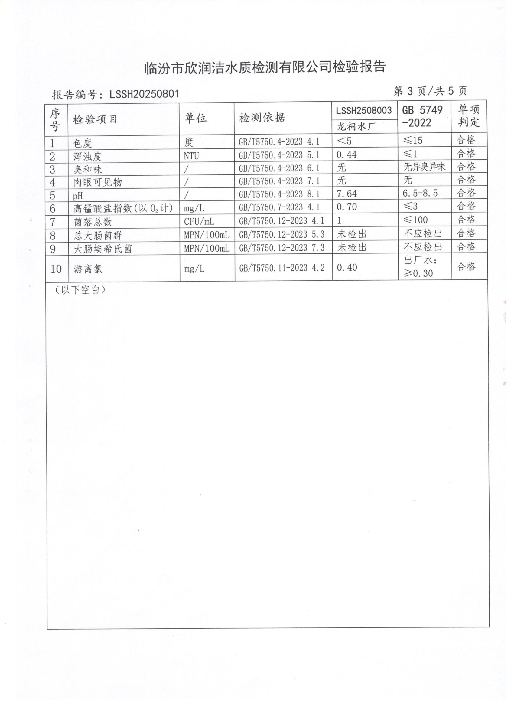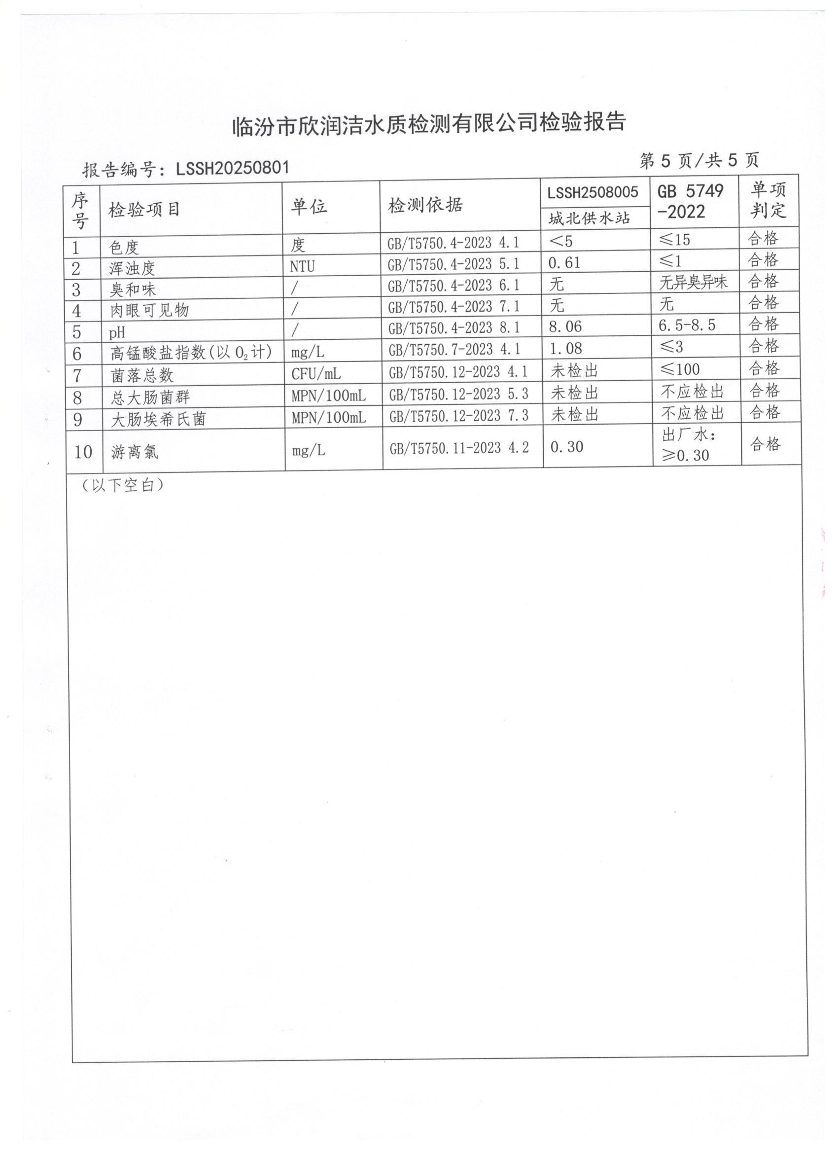 临汾市城市管理局2025年8月份生活饮用水水质监测报告
